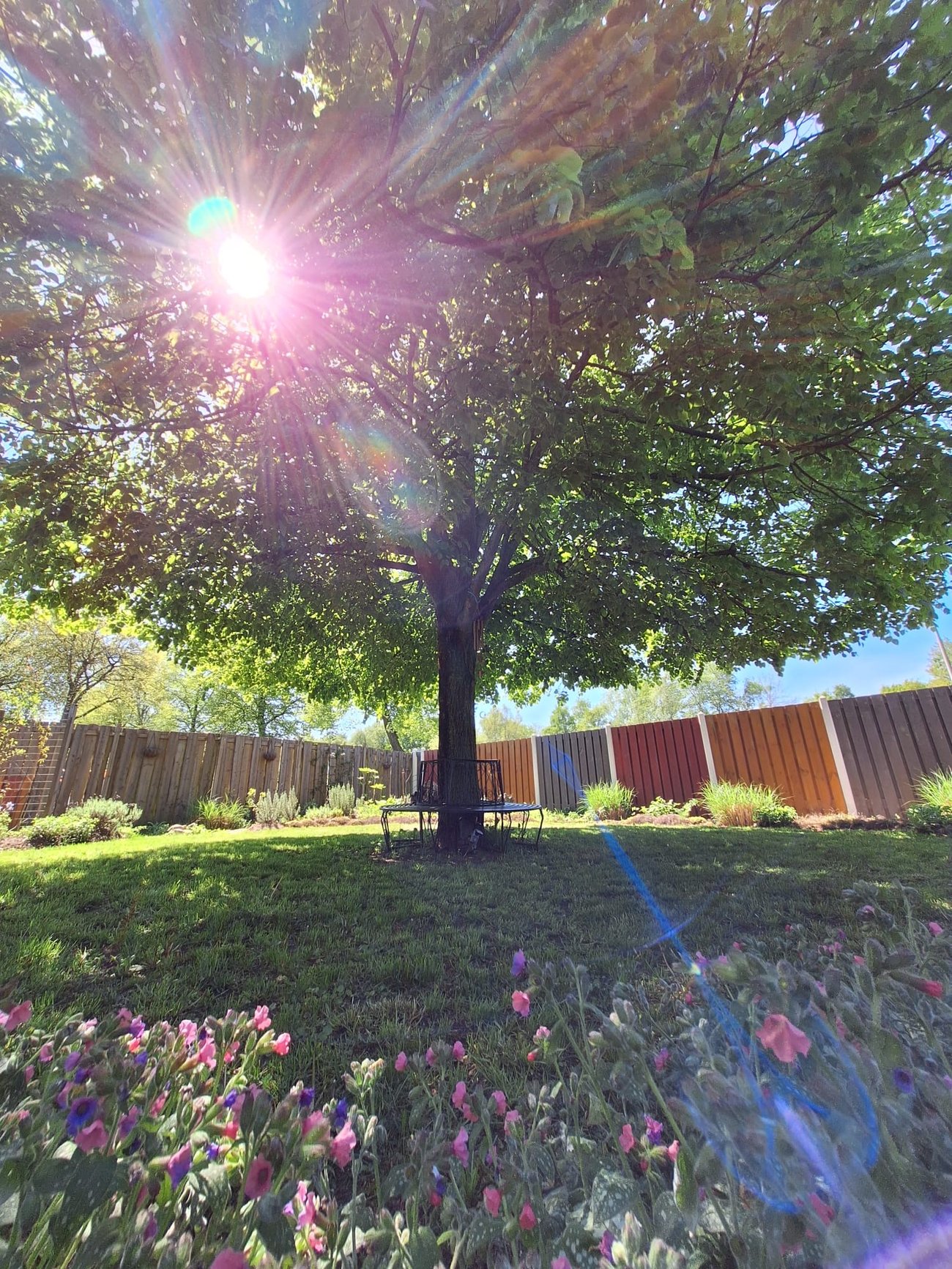 Op dit moment wordt de Zen-tuin elke week mooier! Het gras is weer prachtig groen, de Lindeboom staat op dit moment in bloei en ruikt heerlijk, de kruiden groeien dat het een lieve lust is, de bosaardbeitjes zijn rijp om te plukken (voel je vrij!) en het Meditatie-pad is weer netjes gemaakt! Een genot om in deze heerlijke tuin te zijn en daar ook onze buiten-lessen te geven. Ondertussen: voel je welkom om zelf ook een bijdrage te leveren aan het heerlijke gevoel van deze tuin, door... edelstenen mee te nemen en ergens in de tuin neer te leggen of in de grond te stoppen! Er liggen her in der in de tuin al vele edelstenen, om de energie van de tuin te verhogen. En nu leek het mij zo leuk om ook jou te vragen om (als je kleine of grotere edelstenen hebt die je wilt schenken...) deze mee te nemen en ergens in de tuin te plaatsen. Zodoende verhogen we samen nog meer de helende energie van Het ZENtrum! Op bovenstaande onbewerkte (!!) foto (gemaakt door Suzanne, na haar Qigong les) zie je hoe hoog de energie al is in de tuin...Mooi he?!
