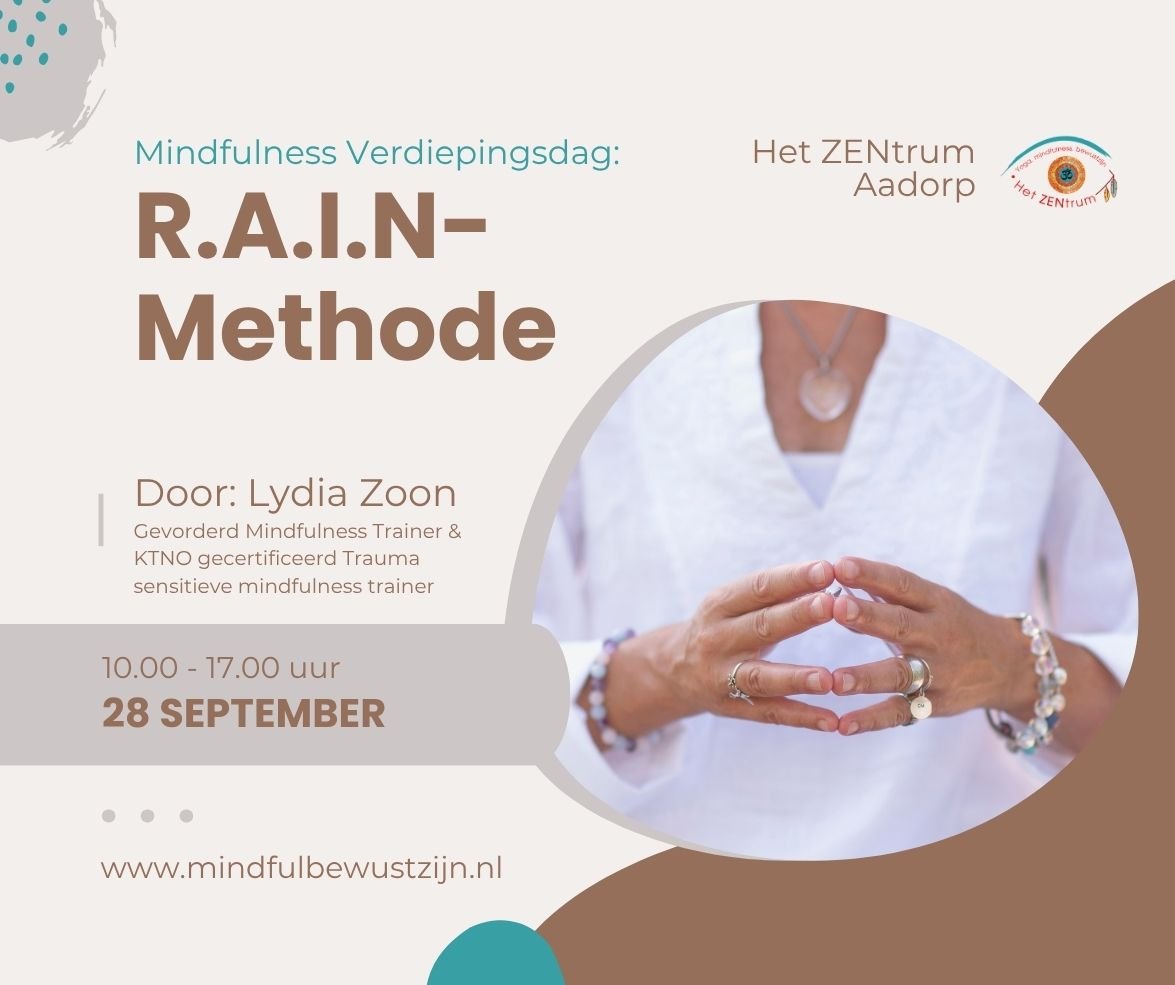 Verdiepingsdag R.A.I.N. - methode Mindfulness Zondag 28 september 10.00 - 17.00 uur Door: Lydia Zoon €70,- incl koffie/thee en lunch